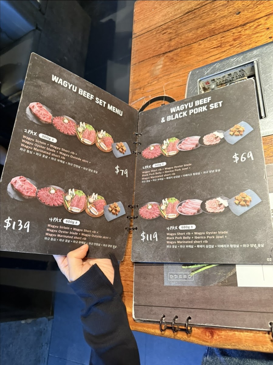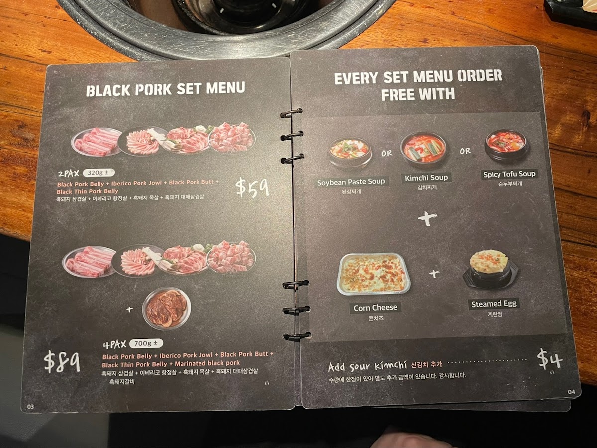 Highlights like marinated black pork, wagyu rib eye, and seafood pancakes showcase the variety of textures and flavors available, while traditional choices such as kimchi soup and steamed egg add warmth and familiarity to the meal. Cold noodles and cheese corn provide lighter, comforting bites that complement the rich grilled offerings.